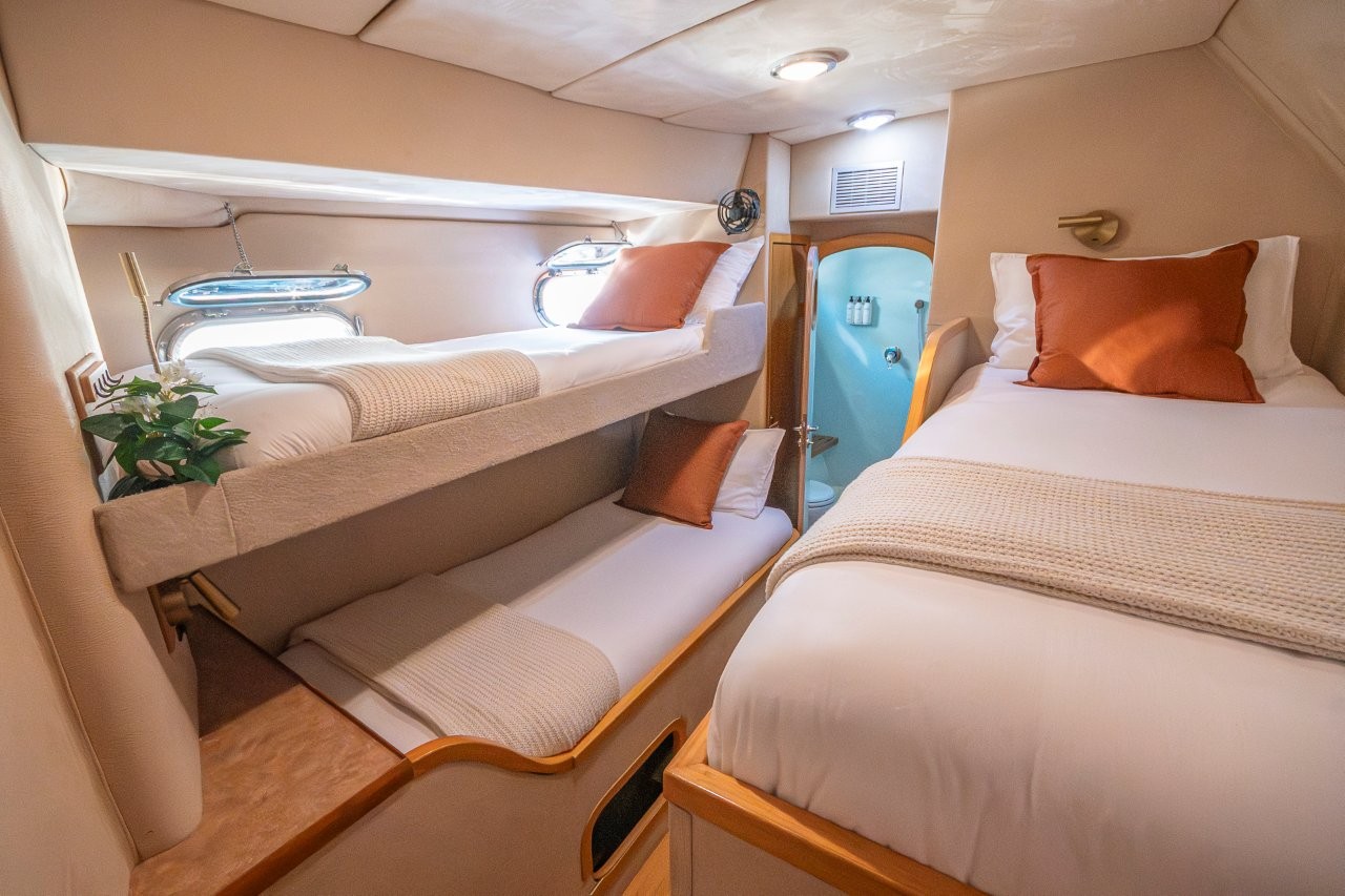 Havanna luxury yacht charters comfortably accommodates up to 9-11 guests, with four comfortable staterooms, plus optional sofa bed. Each cabin boasts a private ensuite, separate toilet and all are air-conditioned, ensuring the utmost comfort throughout your private charter yacht charter. The master stateroom, spanning the yacht’s entire width, serves as a peaceful sanctuary, allowing you to unwind and rejuvenate in style. Enjoy the comforts of staying in touch with internet access, via starlink.