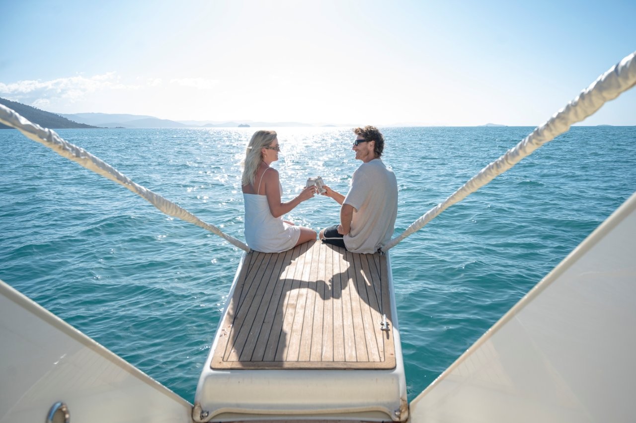 Perfect for a romantic evening, corporate gathering, or pre-dinner cruise, this exclusive 2 hour twilight experience offers uninterrupted views of the sky transforming into a vibrant canvas of oranges, pinks, and purples, framed by the stunning backdrop of Whitsundays Islands while you sip on premium beverages and enjoy freshly-prepared canapés, crafted with fresh local ingredients. Enjoy a tailored sunset cruise, with your personal crew ensuring a seamless and unforgettable evening. (up to 22 guests)
