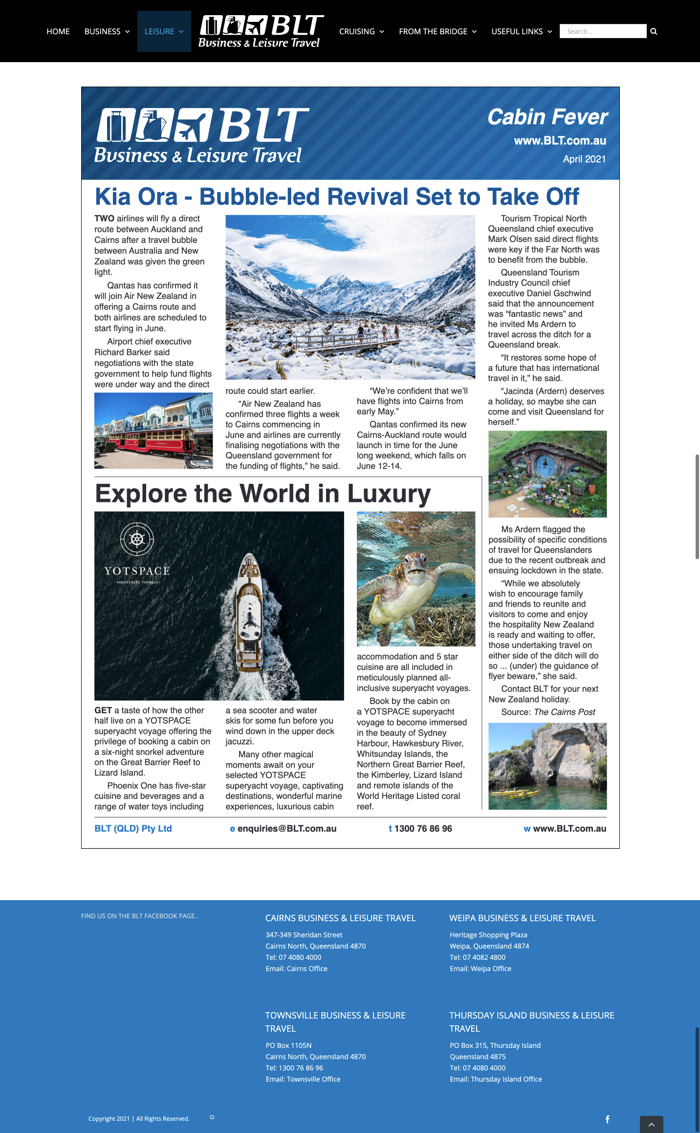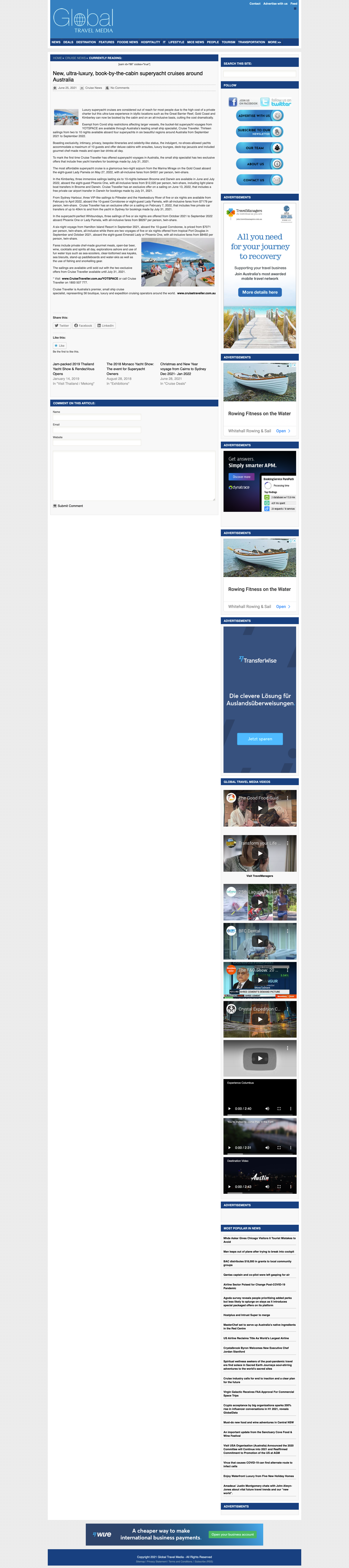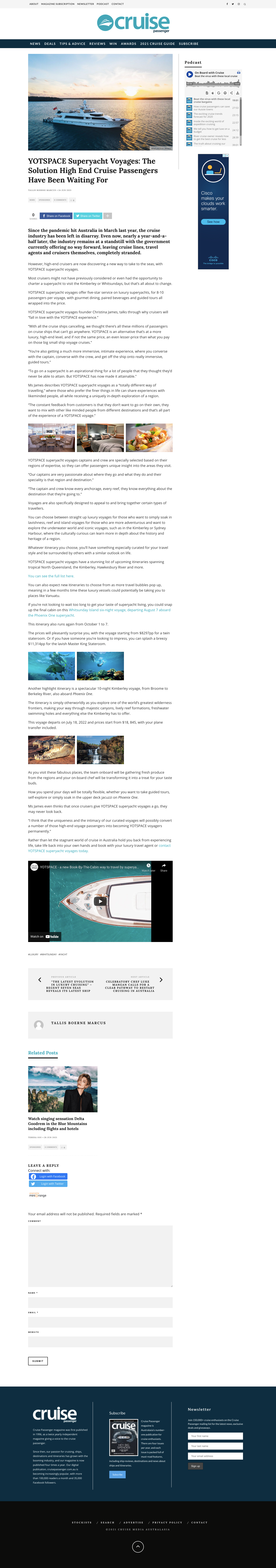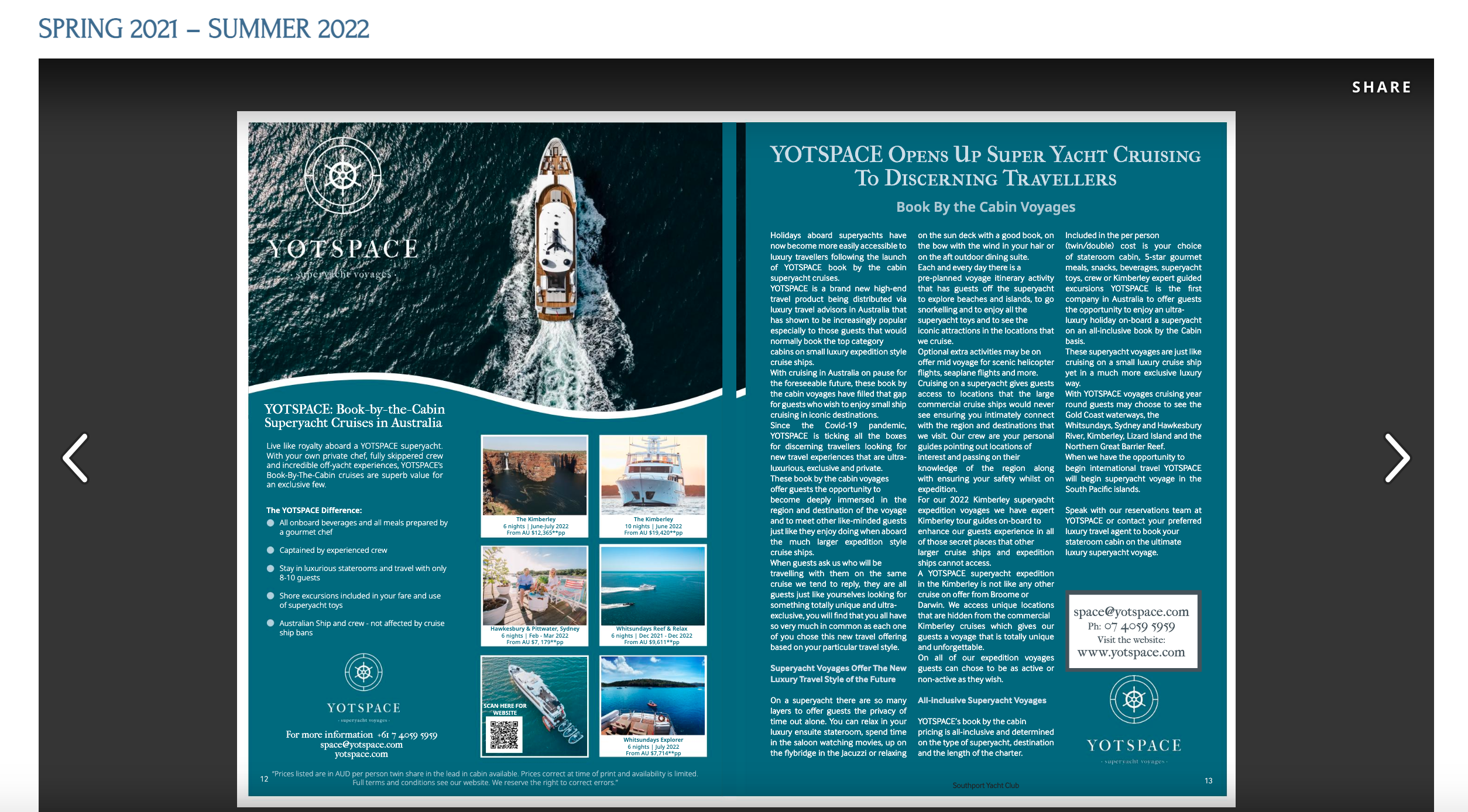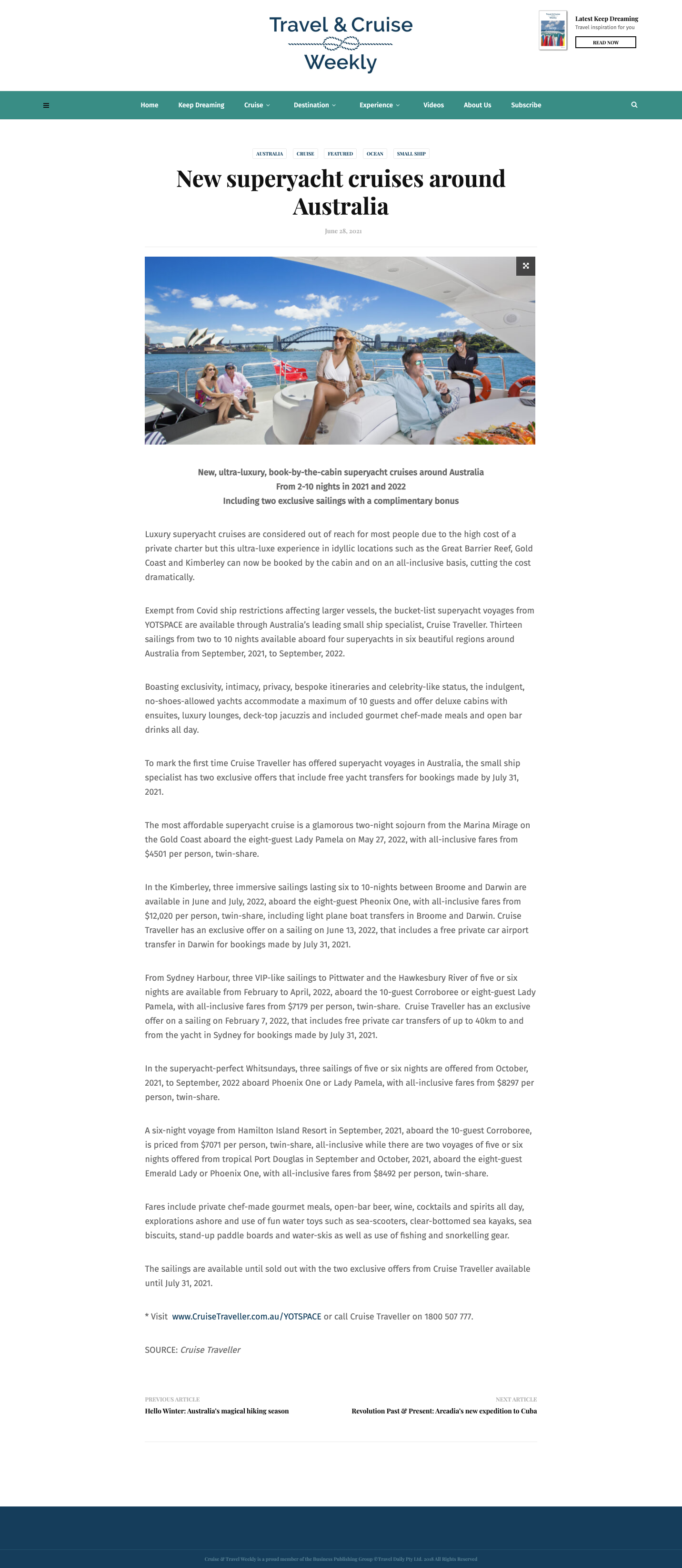 Travel and Cruise Weekly features YOTSPACE book by the cabin superyacht voyages around Australia in Jun 2021 article.