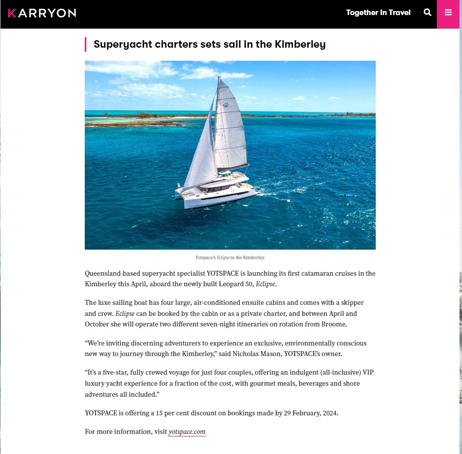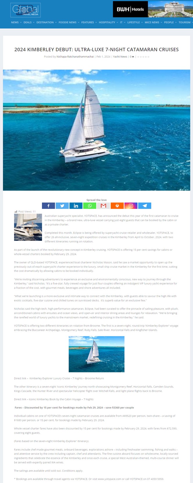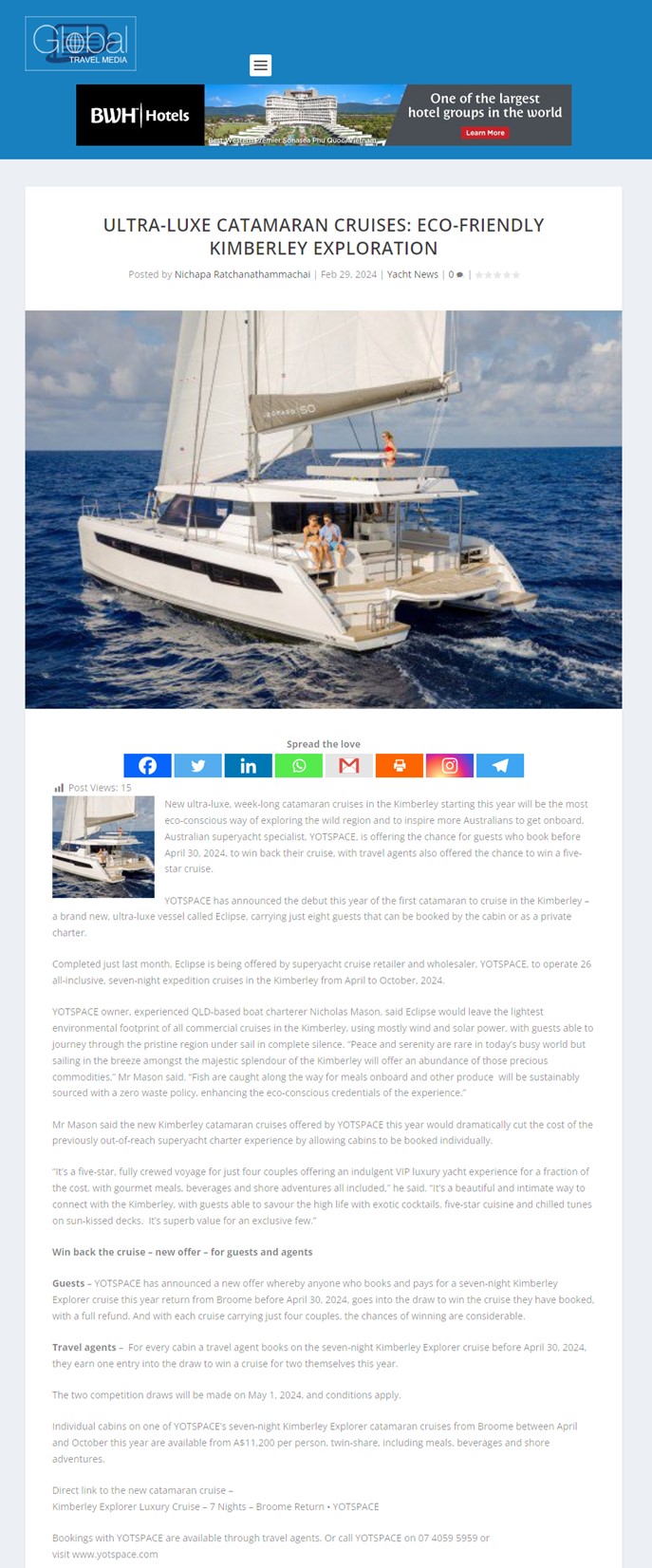 Global Travel Media edition featured YOTSPACE Luxury Kimberley voyages within their Yacht News edition, 29 Feb 2024.