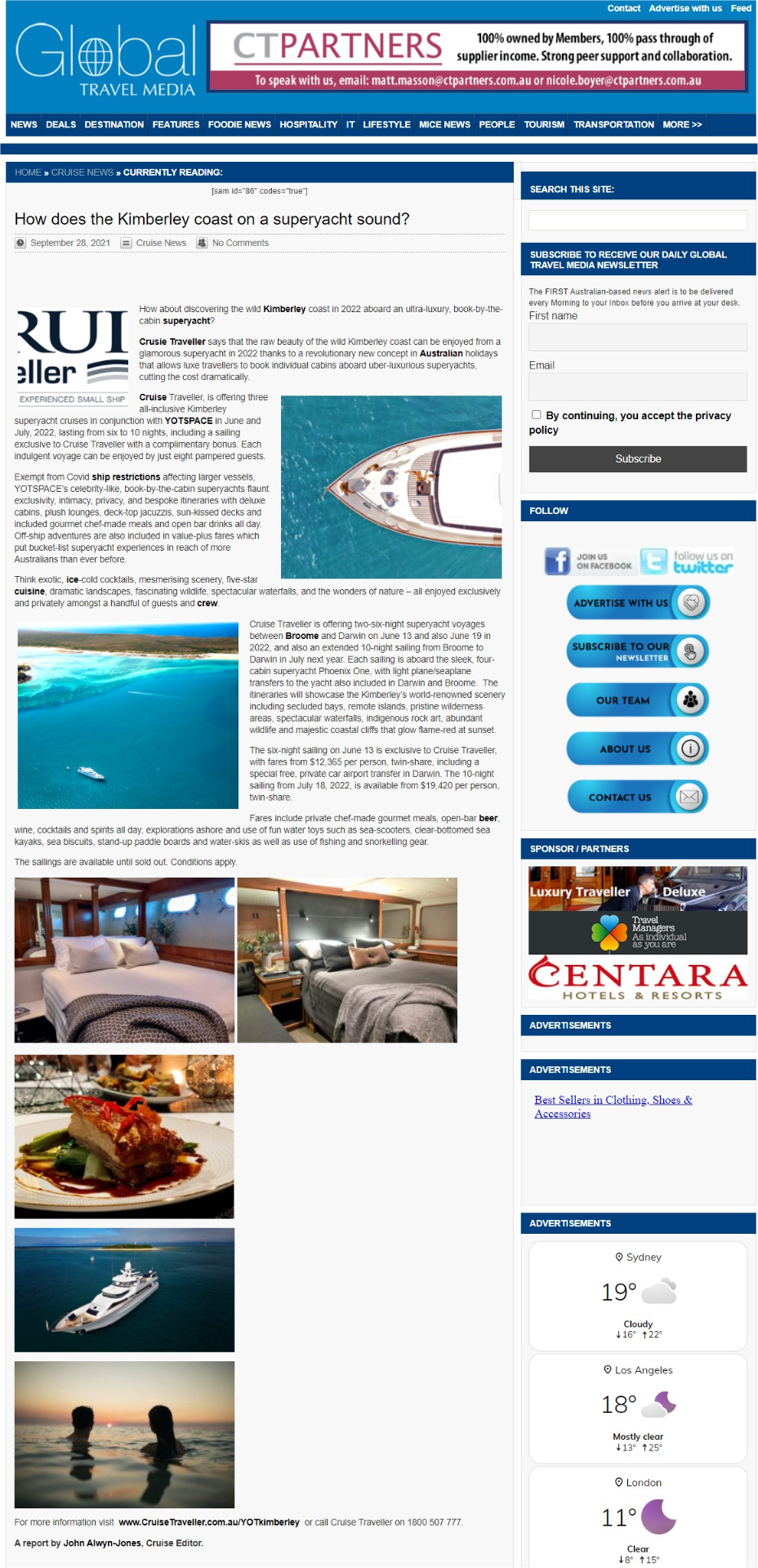 Cruise Weekly includes YOTSPACE book by the cabin superyacht voyages featuring Kimberley Voyages in their Sept 21 edition.