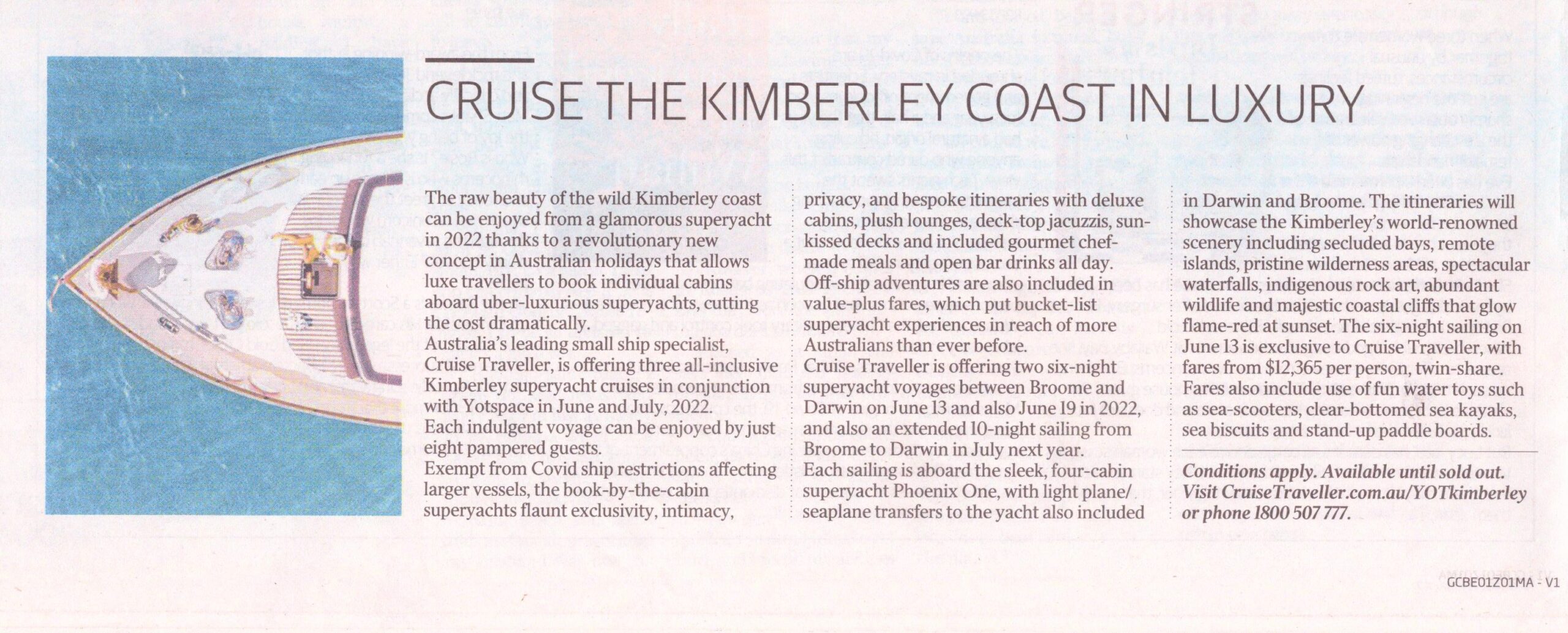 The Gold Coast Bulletin featured YOTSPACE Kimberley cruises with Cruise Traveller in the recent Travel Edition Oct 2021.