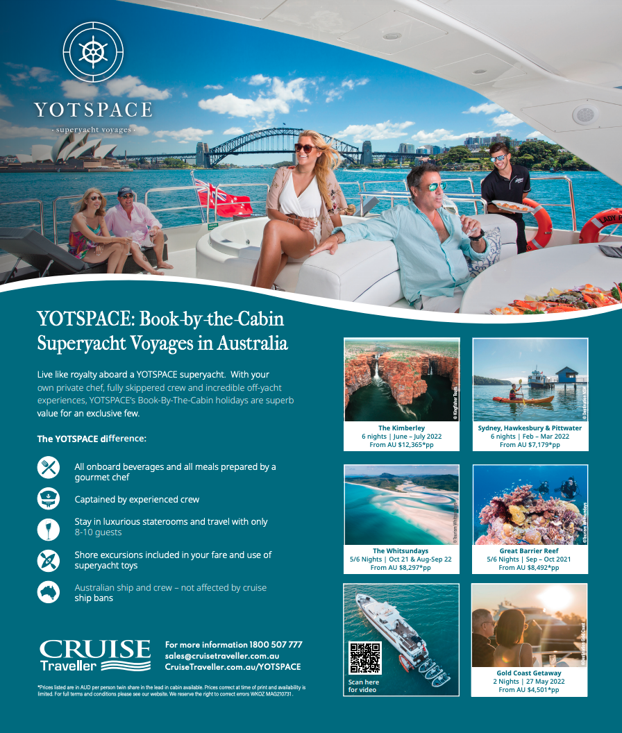 Cruise Traveller Australia’s most experience small ship cruise specialists promote to their VIP clients a Sydney 2022 YOTSPACE superyacht voyage Oct 21.